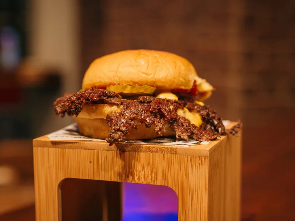 Doble smash 100% buey sin aditivos ni conservantes, queso fundido cheddar premium, pan martin’s potato rolls, pepinillo agridulce, cebolla dulce